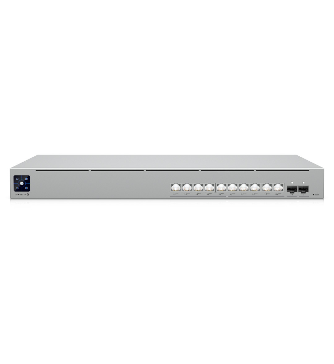 Conta com 10 portas 10GbE RJ45 com suporte a PoE+, PoE++, permitindo alimentar dispositivos exigentes como access points Wi-Fi 6/7, câmeras e equipamentos de rede avançados.